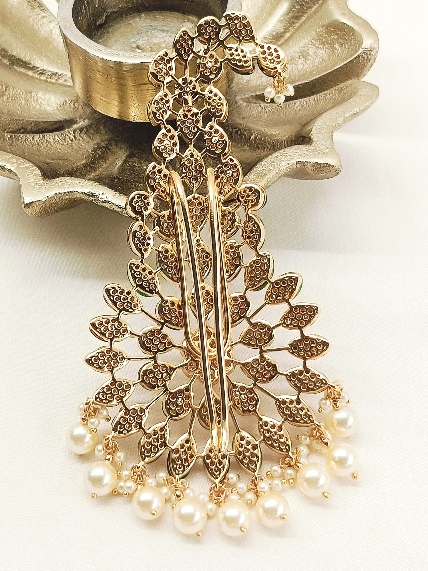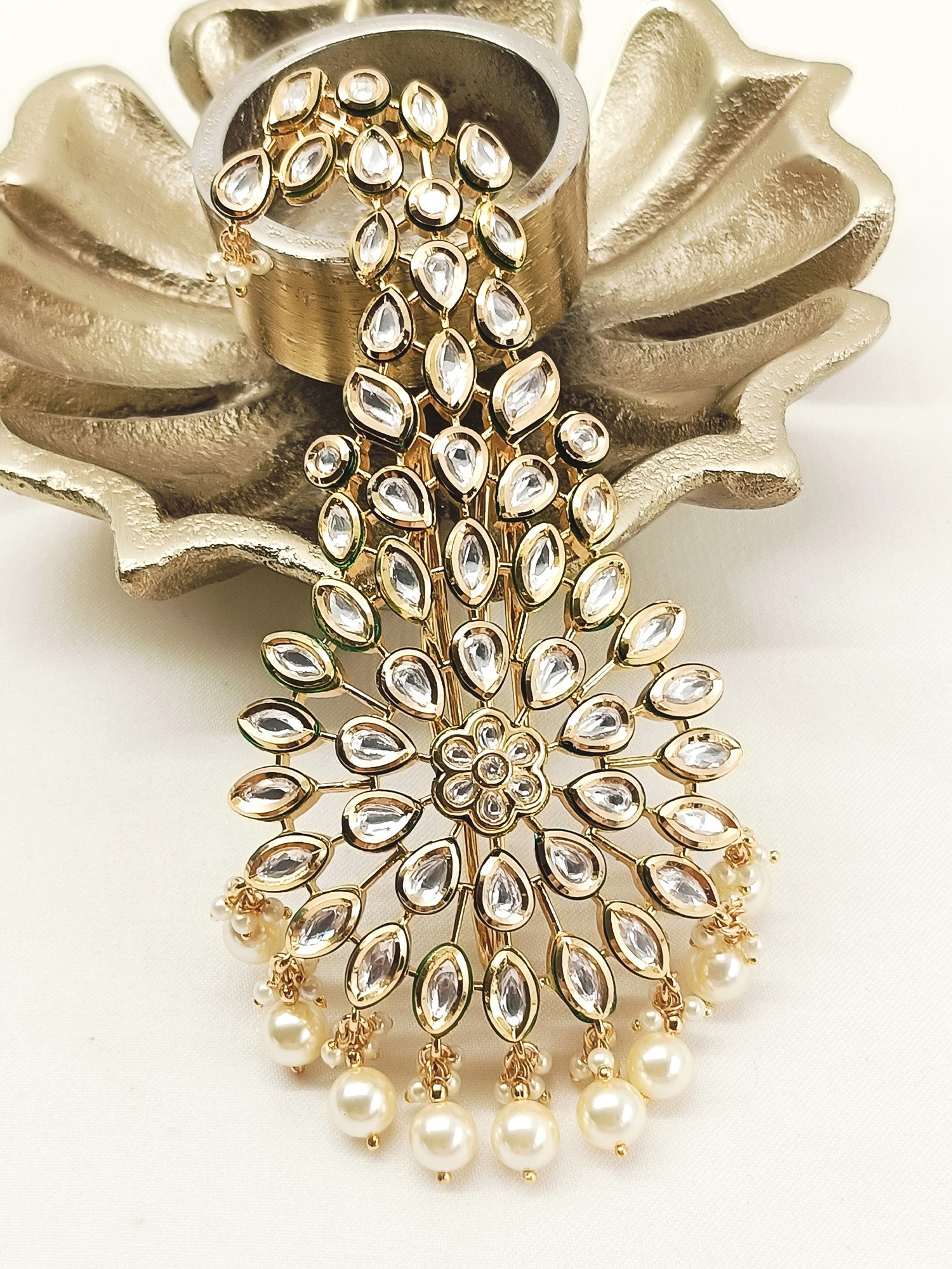 Elevate Your Bridal Ensemble With This Exquisite White Dulha Kalgi, A Timeless Piece Of Traditional Indian Wedding Jewelry. Crafted From Gold-plated Brass, This Ornament Combines Durability With Luxurious Aesthetics. Adorned With Intricate Kundan Work And Delicate Pearl Hangings, It Captures The Opulence Of Classic Bridal Adornment. The White Gemstone Setting Creates An Ethereal Elegance, While The Hanging Pearls Add Graceful Movement And Dimension. Perfect For Grooms Seeking Authentic, Sophisticated Wedding Jewelry That Honors Tradition While Maintaining Contemporary Appeal.