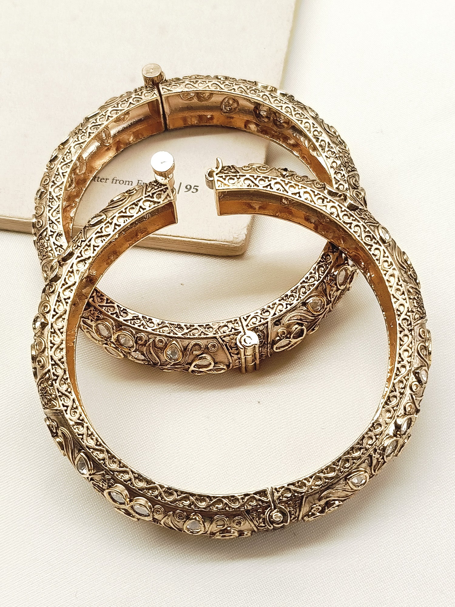 These White Kundan Bangles Feature Intricate Kundan Stones Set In Antique Gold-plated Brass Metal, Combining Traditional Craftsmanship With A Timeless Design. Their Durable Brass Base Ensures Lasting Wear, While The Antique Finish Adds An Elegant, Vintage Appeal. Ideal For Festive Occasions Or Enhancing Ethnic Ensembles, These Bangles Bring A Sophisticated Touch To Your Jewelry Collection.
