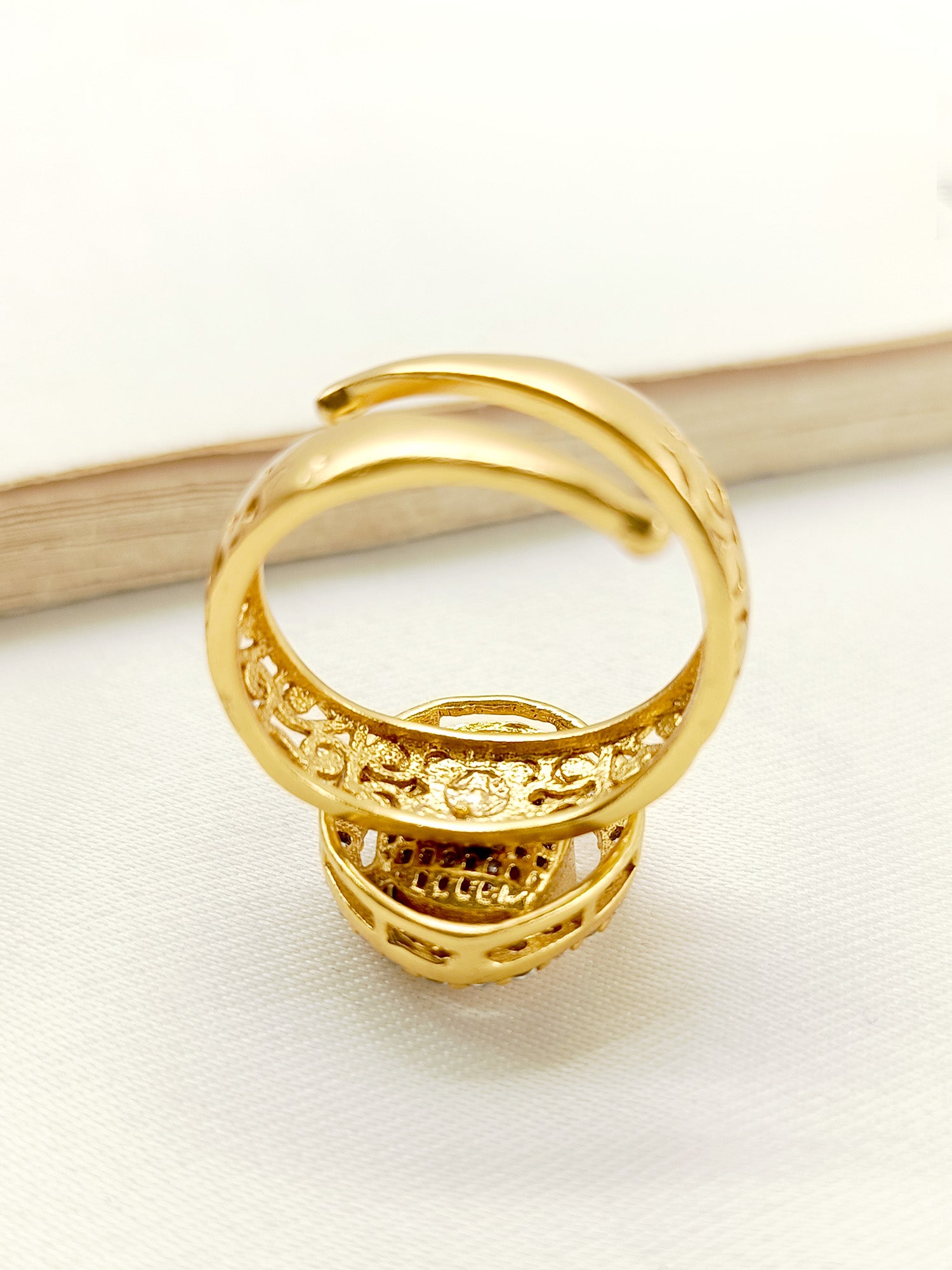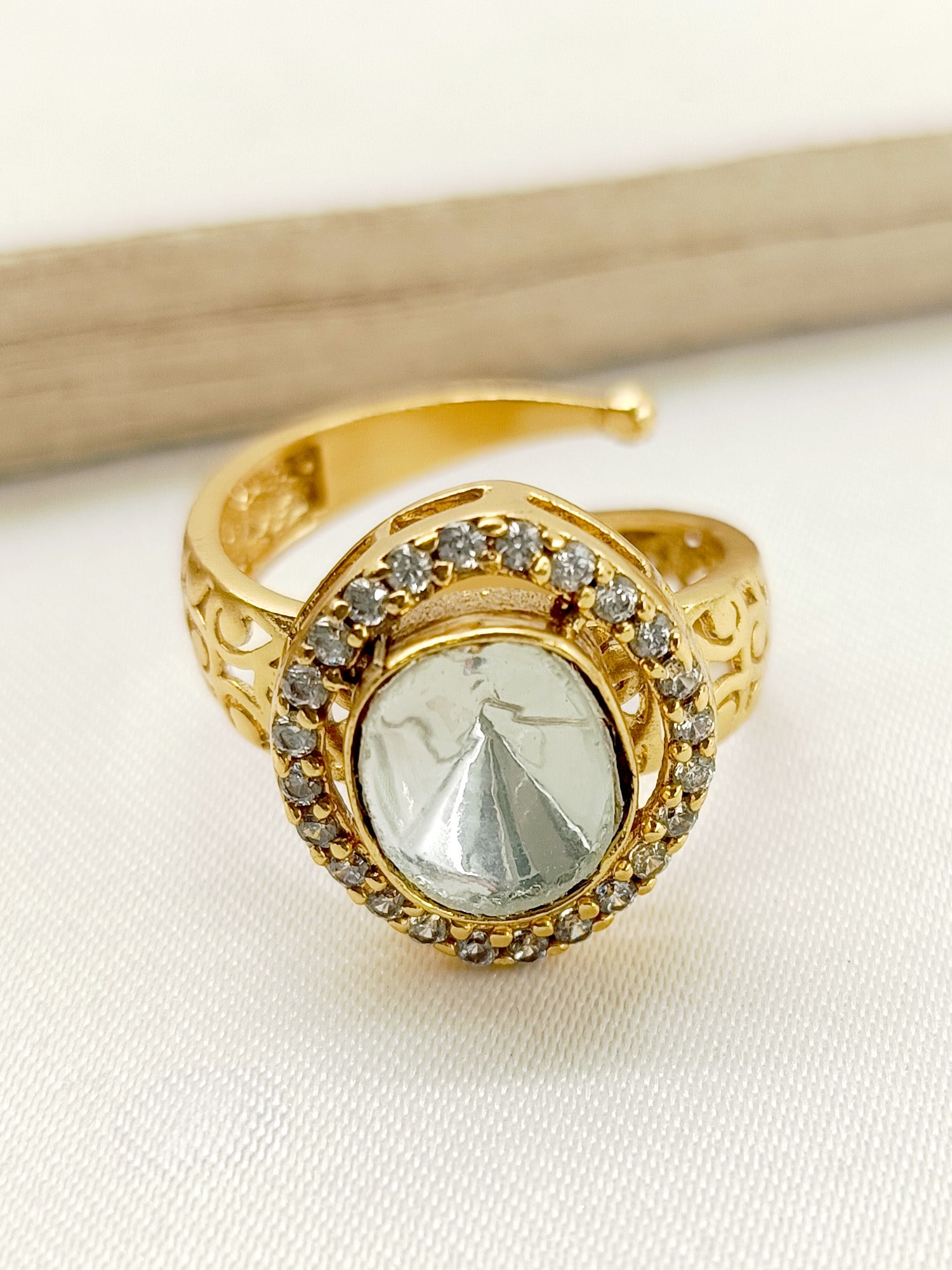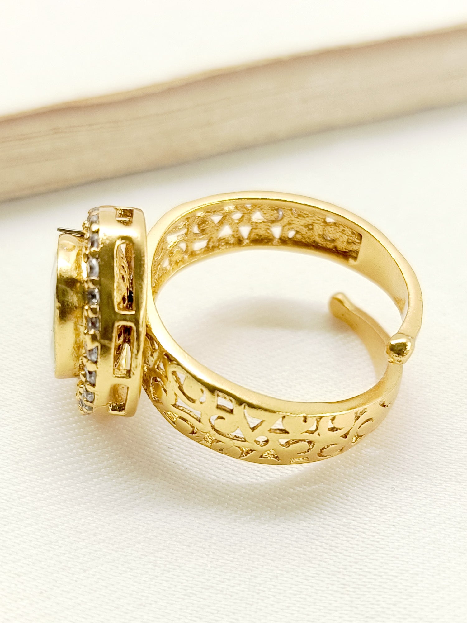 Enhance Your Traditional Look With Our Kundan Finger Ring. Adjustable Antique Gold Plated Brass Metal With American Diamond Setting, This Ring Adds A Touch Of Elegance And Cultural Significance To Your Ensemble. Elevate Your Style With This Exquisite Piece.