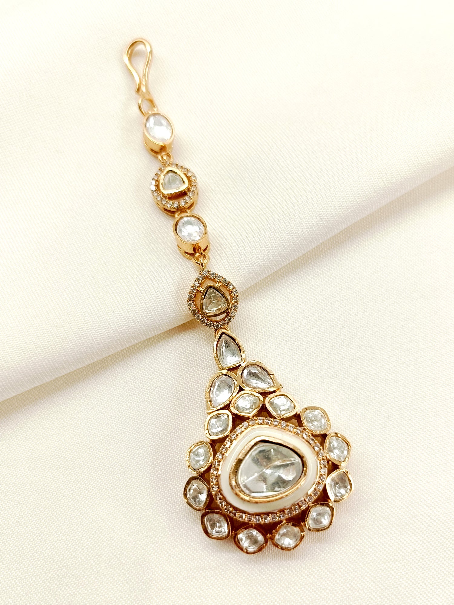 Introducing The Kundan Teeka, A Delicate Piece Of Jewelry Featuring Elegant American Diamonds And Expertly Crafted With Gold Plated Brass Metal. Elevate Your Outfit With This Stunning Teeka That Exudes Timeless Beauty And Sophistication. Perfect For Any Occasion, This Teeka Is A Must-have For Any Jewelry Collection.