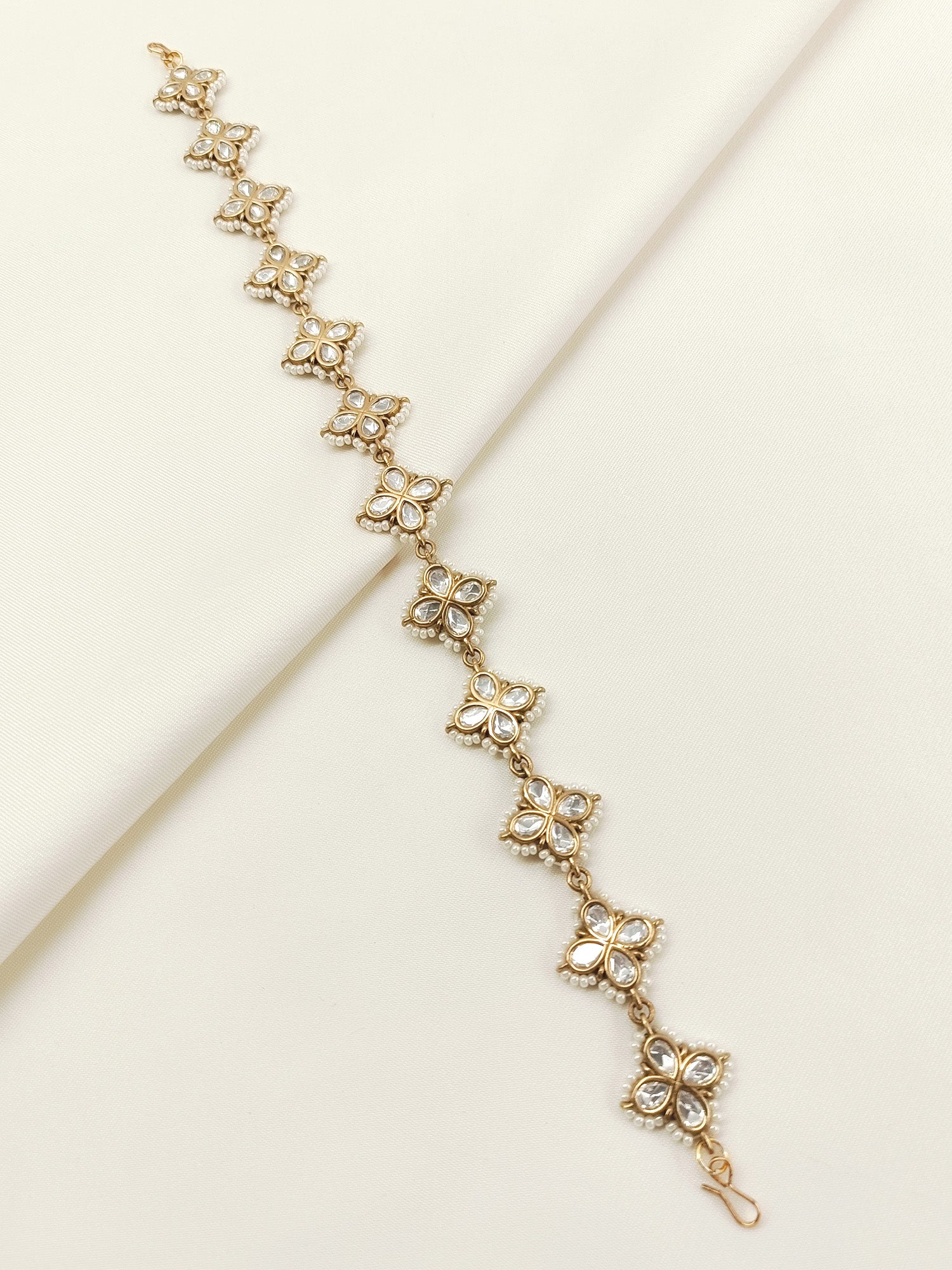 Elevate Your Traditional Look With This Exquisite White Kundan Sheeshpatti, Crafted From Antique Gold-plated Brass Metal. Adorned With Authentic Kundan Stones, Lustrous Pearls.It Reflects Intricate Artistry And Timeless Elegance. Perfect For Complementing Bridal Or Festive Attire, This Sheeshpatti Offers A Regal Statement While Ensuring Lasting Durability And Refined Craftsmanship.