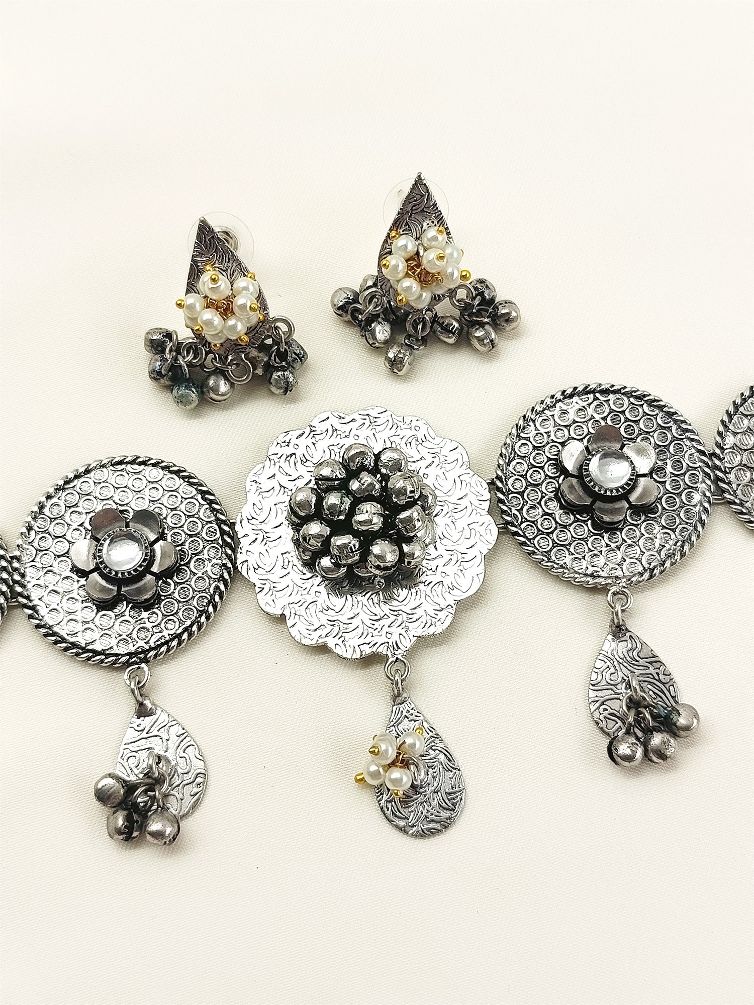This White Oxidized Choker Set Features An Oxidized Silver-plated Brass Base, Offering Durability With A Vintage Appeal. Adorned With Semi-precious Stones And Delicate Pearl Hangings, It Combines Elegance With Artisanal Craftsmanship. Ideal For Adding A Sophisticated Touch To Traditional And Contemporary Outfits Alike.