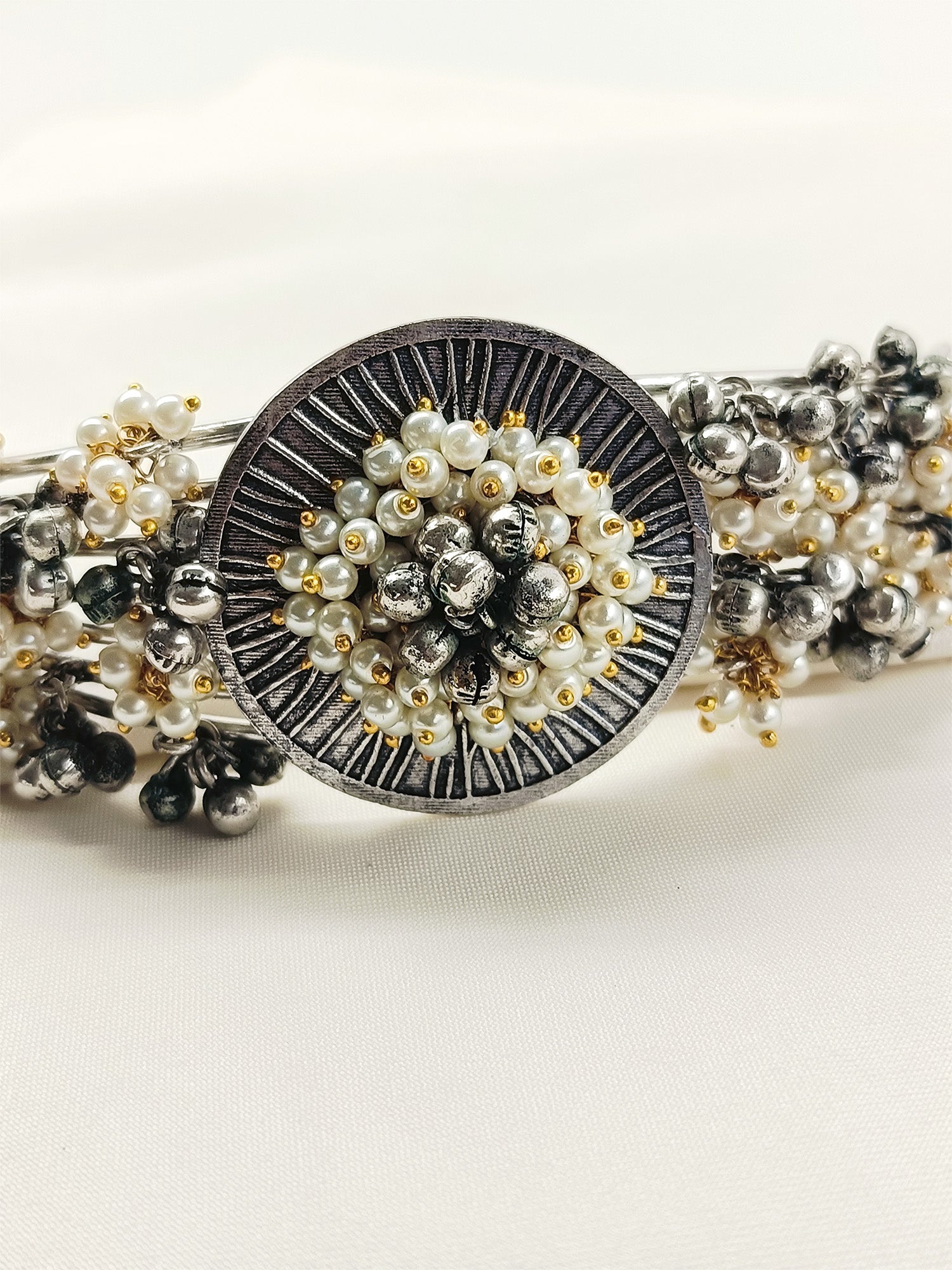 This White Pearl Oxidized Choker Set Features An Elegant Blend Of Oxidized Silver-plated Brass And Delicate Pearls, Enhanced With Traditional Ghunghroo Accents. Designed To Offer A Timeless Appeal, It Combines Classic Craftsmanship With Contemporary Style, Making It An Ideal Accessory For Both Festive Occasions And Everyday Wear. The Oxidized Finish Ensures Durability While Adding A Vintage Charm, And The Lightweight Construction Provides Comfortable Wear Throughout The Day. Elevate Your Jewelry Collection With This Expertly Crafted Choker Set That Balances Tradition And Modern Elegance.