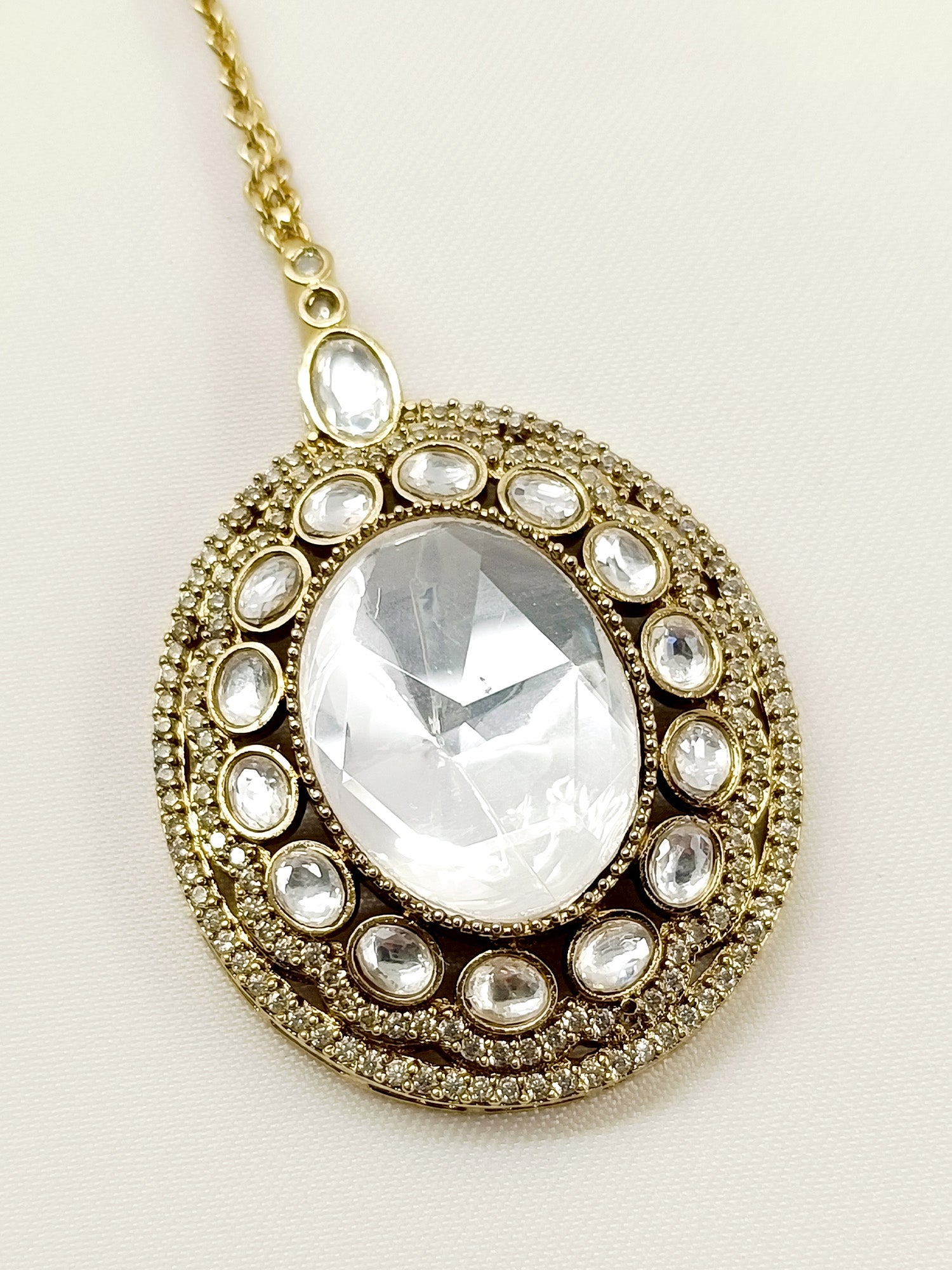 Add A Touch Of Elegance To Your Traditional Attire With Our White Victorian Teeka. Made Of Antique Gold Plated Brass Metal, It Features Stunning American Diamond And Mossonite Stones. Enhance Your Look With This Timeless Beauty.