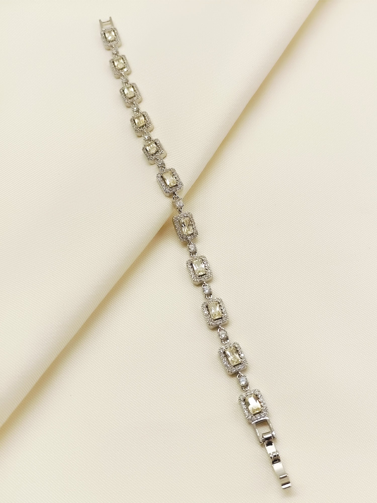 Elevate Your Accessory Collection With This Yellow American Diamond Bracelet, Crafted From Brass Metal With A Refined Silver Plating. Featuring Expertly Set American Diamonds And Semi-precious Stones, It Offers Lasting Brilliance And A Sophisticated Sparkle. This Bracelet Balances Traditional Craftsmanship With Contemporary Style, Making It An Ideal Choice For Both Special Occasions And Everyday Elegance.
